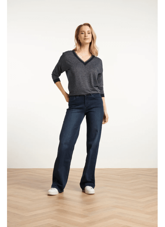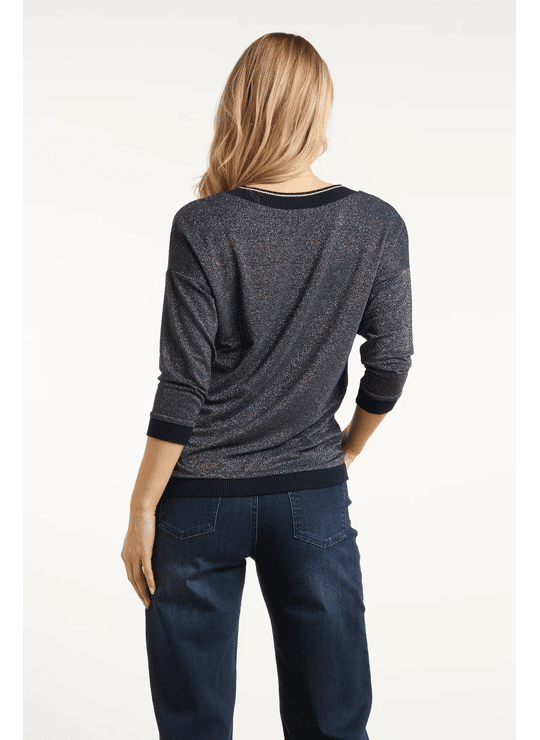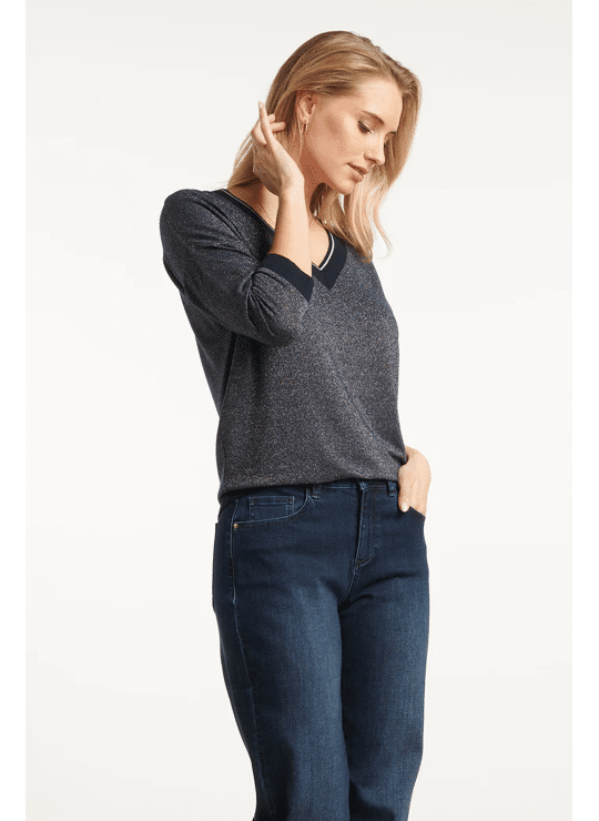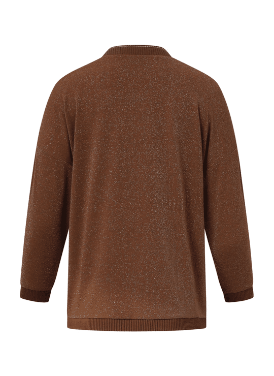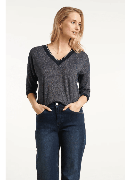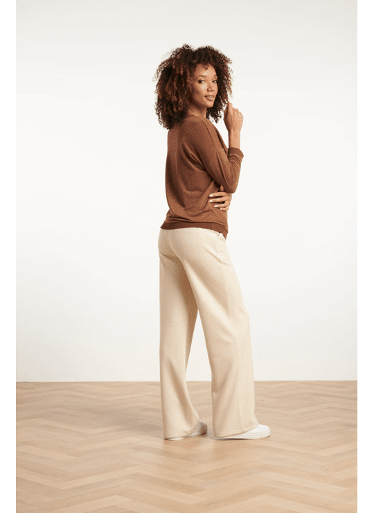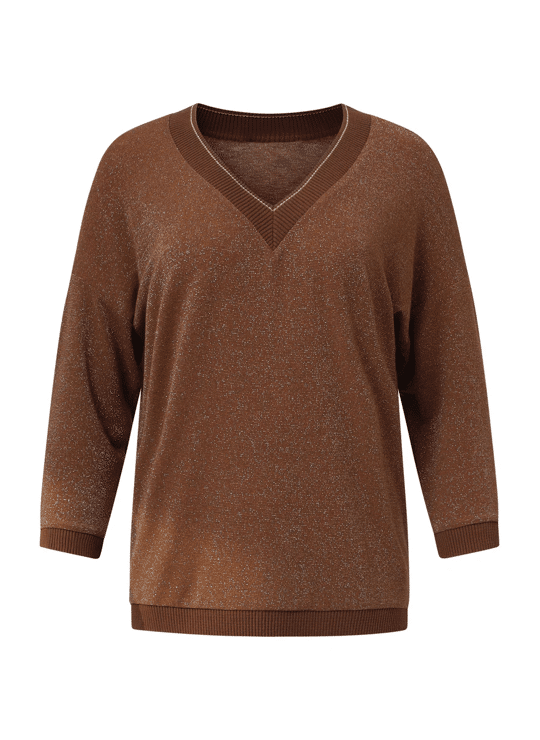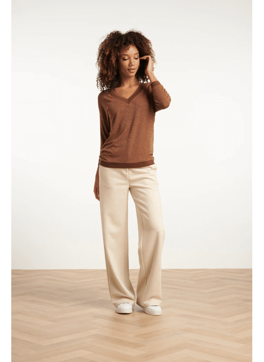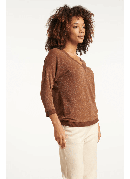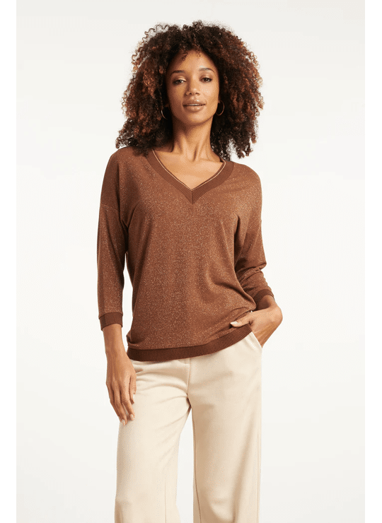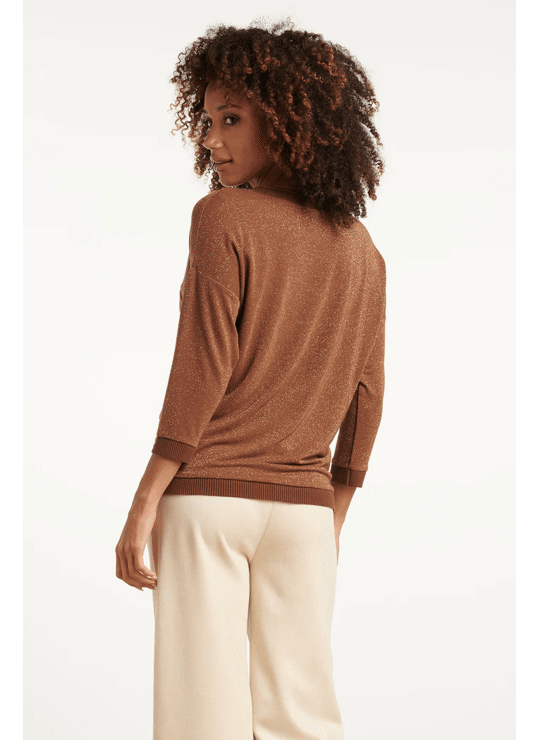 Deze stijlvolle bruine Smashed Lemon top valt los en biedt een comfortabele, ontspannen pasvorm. Het hoogwaardige bruin-lurex materiaal met 75% viscose geeft de top een luxe uitstraling. De 3/4 mouwen en de V-hals zijn elegant afgewerkt met een subtiele bruine en gouden lurex tape, die ook terugkomt bij de manchetten en de zoom. Dankzij de korte lengte is deze dames top makkelijk te combineren met diverse casual en chique looks Belangrijkste kenmerken: • Warme bruine met gouden lurex details voor een verfijnde look • Losvallende pasvorm met 3/4 mouwen • V-hals afgewerkt met bruine en gouden lurex tape • Hoogwaardig materiaal met 75% viscose Verkrijgbaar in navy, brown.