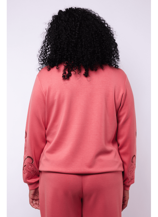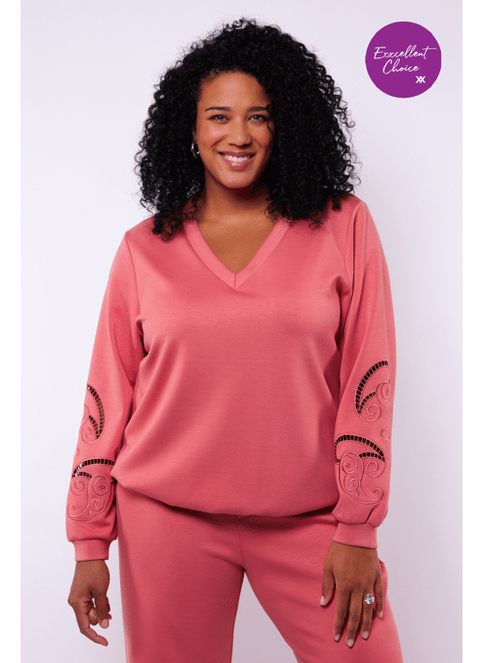 De Fiene sweater combineert comfort met een verfijnde, vrouwelijke look. De V-hals geeft het model een elegante uitstraling, terwijl de geborduurde mouwen met subtiele cut-outs en siersteentjes zorgen voor een stijlvolle touch. Gemaakt van een soepele stretchkwaliteit die zacht aanvoelt en mooi valt. Perfect te dragen met de Mira broek voor een harmonieuze, modieuze combinatie.