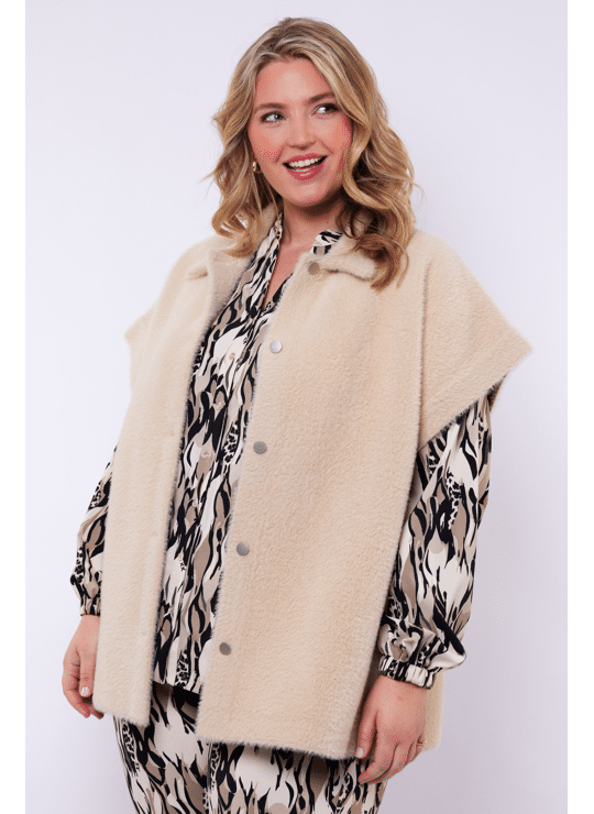 Een moderne laagjesfavoriet met een zachte touch. Het Laurena gilet heeft een comfortabele, teddyachtige structuur en korte mouwen voor een eigentijdse look. De kraag en knoopsluiting geven het item een stoere, maar vrouwelijke uitstraling, perfect om eindeloos te combineren.
