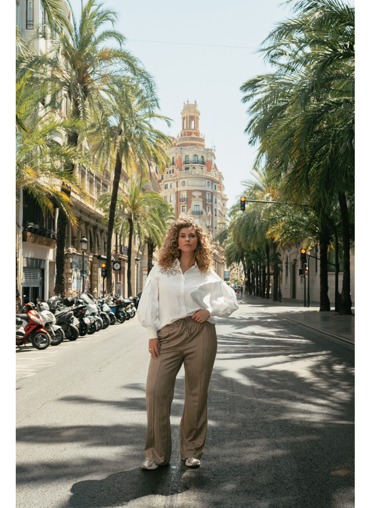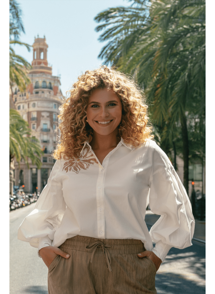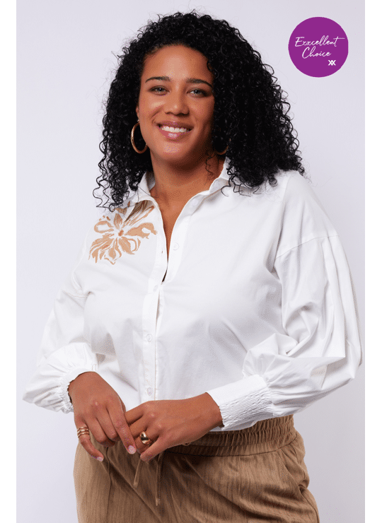 De Calista blouse combineert elegantie met comfort. Gemaakt van een zachte katoen-elastaanmix, biedt deze blouse een fijne pasvorm en subtiele stretch. Het geborduurde accent op de schouder zorgt voor een stijlvolle blikvanger, terwijl de pofmouwen en klassieke kraag de look compleet maken.