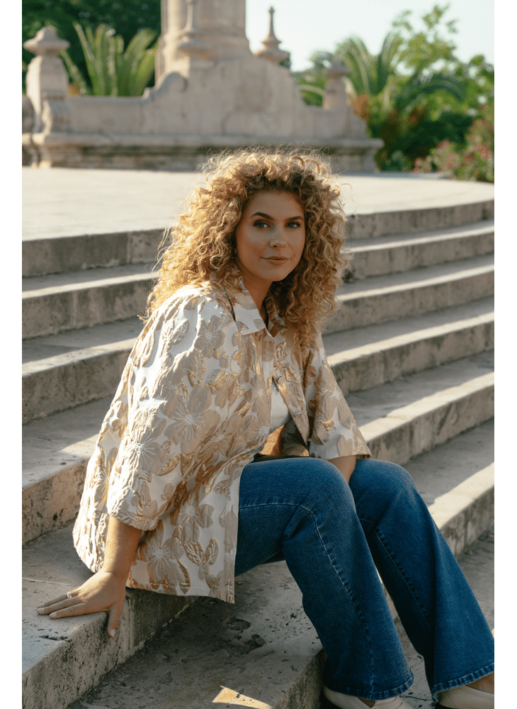 De Kiranne jacket is uitgevoerd in een rijke jacquardstof met glanzend bloemmotief. De rechte snit en driekwartmouwen zorgen voor een elegante look met een moderne twist. Perfect te combineren voor zowel een chique gelegenheid als een stijlvolle everyday look.