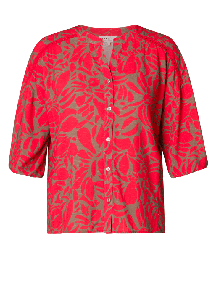 De Semya blouse is gemaakt van soepele jersey viscose en heeft een rode print. Het model heeft halflange mouwen met elastiek, een rond kraagje en een knoopsluiting. De stof voelt zacht aan en biedt veel draagcomfort — ideaal voor elke dag.