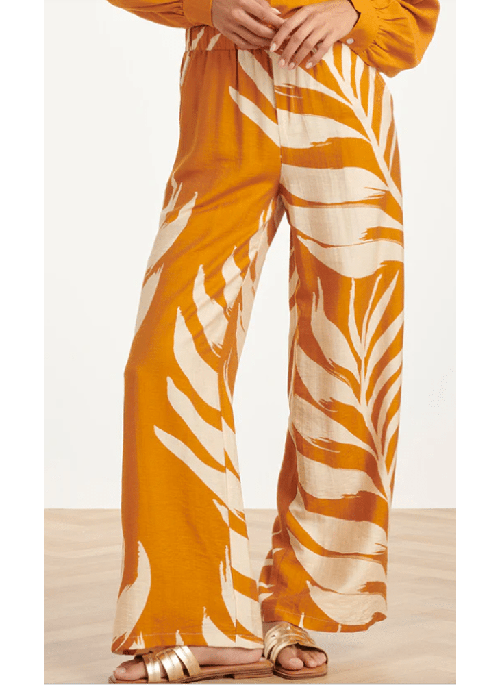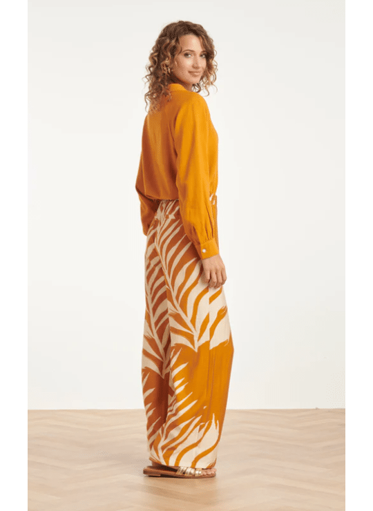 Ervaar ultiem draagcomfort zonder in te leveren op stijl met deze prachtige pantalon van Smashed Lemon. De broek is uitgevoerd in een warme oker geel kleur en voorzien van een grootschalige, witte botanische blad print die zorgt voor een krachtig visueel statement. Met zijn hoge, elastische taille en wijde pijpen is dit de ideale broek voor een elegante zomerse look, of je nu naar een tuinfeest gaat of geniet van een vrije dag. Belangrijkste kenmerken: Comfortabele taille: De elastische tailleband zorgt voor een perfecte pasvorm de hele dag door. Flatterend model: De wijde pijpen creëren een verlengend effect en een elegante valling. Luchtige stof: Vervaardigd uit een lichte, ademende stof die perfect is voor warmere temperaturen.