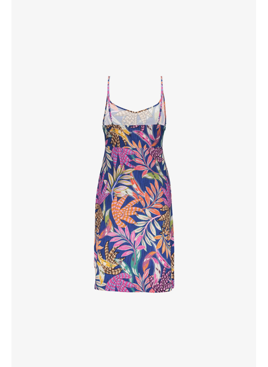 Deze jurk uit onze S26-1 collectie is een zomerse essential met een speels swirldessin. De smalle spaghettibandjes en het vrouwelijke silhouet geven het ontwerp een luchtige uitstraling. Dankzij de soepele tricotkwaliteit draagt de jurk comfortabel en valt hij mooi langs het lichaam. Perfect voor warme dagen waarop je gemakkelijk een stijlvolle en ontspannen look wilt creëren.