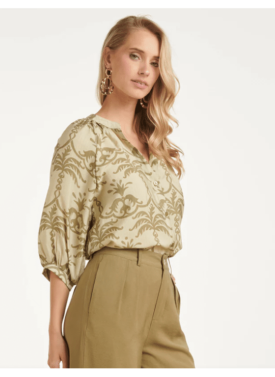 Breng de tropen naar je kledingkast met deze frisse blouse van Smashed Lemon. De blouse is voorzien van een verfijnde groene palmprint en een klassieke knoopsluiting aan de voorzijde. Met de driekwart mouwen en de soepele stof is dit een ideaal item voor een zonnige dag. Belangrijkste kenmerken: Frisse groene palmprint voor een zomerse en stijlvolle uitstraling. Comfortabele driekwart mouwen met een lichte pof voor extra detail. Hoogwaardige afwerking met een elegante v-hals en knoopjes.
