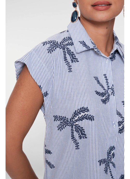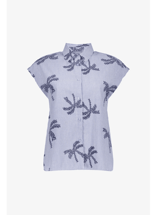 Deze blouse uit onze S26-2 collectie is onderdeel van een van onze zomerse co-ord sets. De klassieke kraag en volledige knoopsluiting zorgen voor een cleane basis, terwijl de aangeknipte mouwen een moderne, ontspannen look geven. De combinatie van het streepdessin en de subtiele palmboom borduursels voegen een speels en luxe accent toe. Dankzij de lichte splitjes aan de zijkant valt het model soepel en comfortabel. Perfect als onderdeel van een stijlvolle co-ord set.